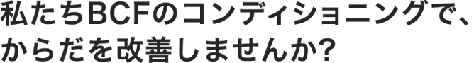 私たちBCFが提供するコンディショニングとは、個々人のからだの「最適なコンディションづくり(Conditioning)」のこと。 生活習慣病の予防や姿勢改善からアスリートのパフォーマンスアップまで、私たちは最新のスポーツ医科学にもとづいたマンツーマンの運動指導を提供します。
